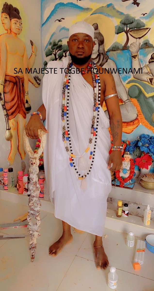Prêtre traditionnel béninois, spécialiste du culte de la sirène et du serpent, Sa Majesté Tôgbé Hounwênami pratique la divination et les rites ancestraux depuis plus de 15 ans. Il aide les âmes en souffrance à retrouver la paix, la protection et la prospérité.